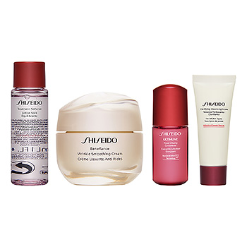 WRINKLE CORRECTING RITUAL - This holiday season, play and celebrate every women beauty from japan to the world with Shiseido. Discover the best gift ideas and find the perfect christmas gift for her and for all your beloved ones. This set contains: BENEFIANCE Wrinkle Smoothing Cream 50 ml - A silky, smooth anti-wrinkle cream that makes skin feel more responsive to the anti-aging benefits of your skincare for a plumper, youthful-looking skin. Use morning and evening. Take two pearl size amounts and place on five points of the face (each cheek, forehead, nose, and chin). Smooth from the center outward. Clarifying Cleansing Foam 15ml - Cleanse and balance skin with this daily foaming face wash infused with signature Japanese ingredients. White Clay absorbs excess oil, Yomogi Extract prevents roughness, Rice Germ Oil softens, and pure Kirishima Mineral Spring Water helps supplement skin essential minerals. Use daily, in the morning and evening as the first step in your skincare routine. Wet skin with lukewarm water. Dispense a pearl-sized amount of cleanser onto dampened hands and rub hands together to create a lather. Massage over your face with gentle circular motions, then rinse thoroughly with lukewarm water. Treatment Softener 30ml - For normal and combination to oily skin. The 24-hour moisturizing lotion feels fresh and absorbs quickly into the skin for all day hydration. Saturate a cotton pad and wipe gently over face. ULTIMUNE Power Infusing Concentrate 10 ml - This anti-aging Serum gets even stronger with an innovative double anti-aging technology powered by 8 botanical ingredients. Experience a healthy and youthful-looking skin. Use Ultimune after cleansing and softening skin, but before applying any other serums or moisturizers.Pump twice onto your fingertips and smooth evenly over face and neck. Use Ultimune twice daily, morning and night.